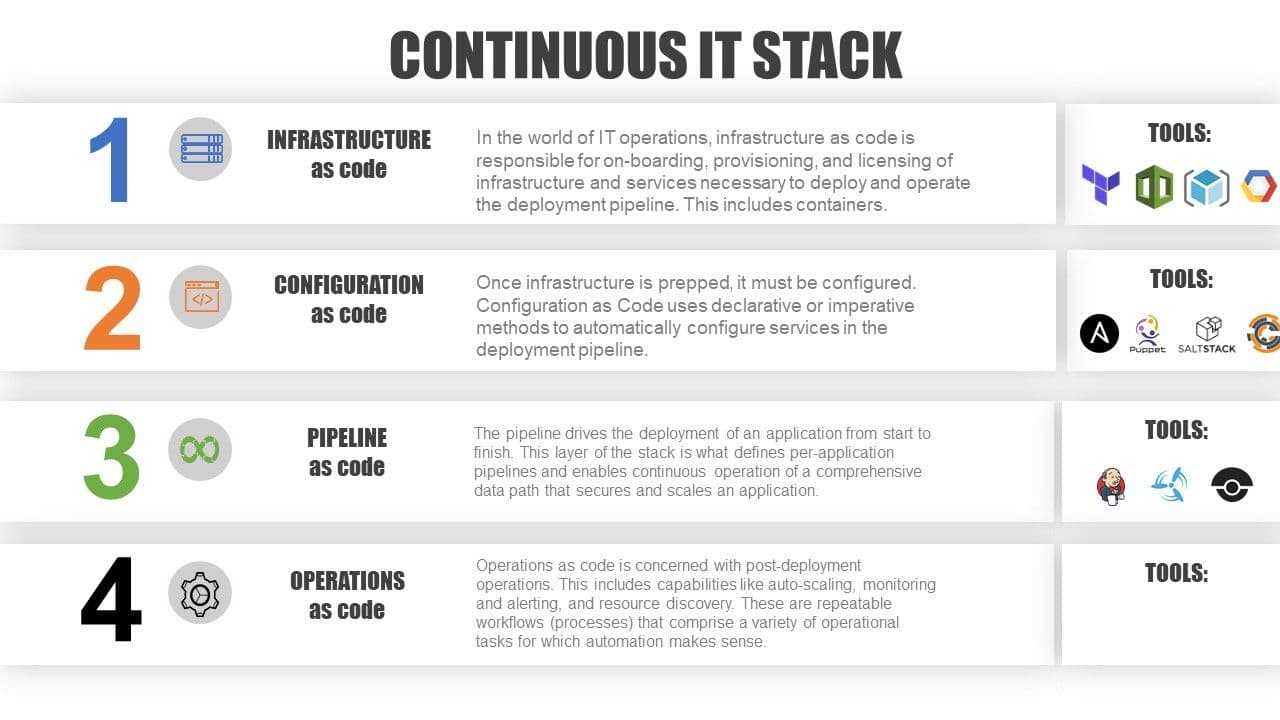 The goal is to build up a continuous IT stack capable of supporting per-app deployment schedules and architectures in a multi-cloud environment. And because deployment is only the beginning of an application's active lifecycle, there needs to be a fourth layer that focuses on post-deployment operations. This is in addition to the three core layers covering infrastructure provisioning and onboarding, service configuration and management, and the deployment pipeline.