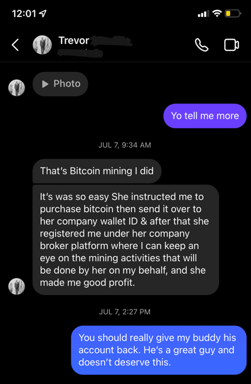 The bad actors posted on their Instagram stories a not-so-subtle message about getting involved in a bitcoin mining scheme. It was a screenshot of an iPhone lock screen which included a picture from their profile (in the case of Trevor, a picture of he and his wife from his profile) and displayed a bogus text message from BofA, followed by a screenshot from his supposed bank account: