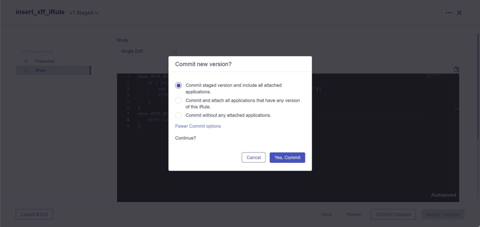 BIG-IP Next expands on the iRules toolset by giving you better visibility, a more streamlined and resilient revision control process, and improved flexibility in the commit process.