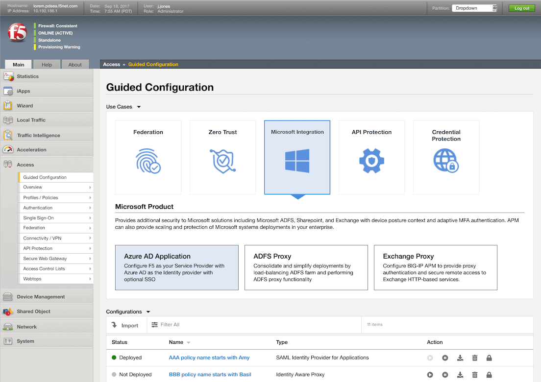In the next version of F5 BIG-IP APM—scheduled to be released this summer—the Advanced Guided Configuration (AGC) for APM has added the ability for administrators to simply onboard and operationally manage mission-critical applications (such as select SAP and Oracle applications) to Azure AD. The administrator no longer needs to go back and forth between Azure AD and BIG-IP as the end-to-end operation policy management has been integrated directly into the APM AGC console. This deeper integration between BIG-IP APM and Azure AD delivers an automated “easy button” to ensure such mission-critical applications can quickly, easily support identity federation, SSO, and MFA. This seamless integration between BIG-IP APM and Azure AD reduces management overhead, meaning that the integration now also enhances the administrator experience.
