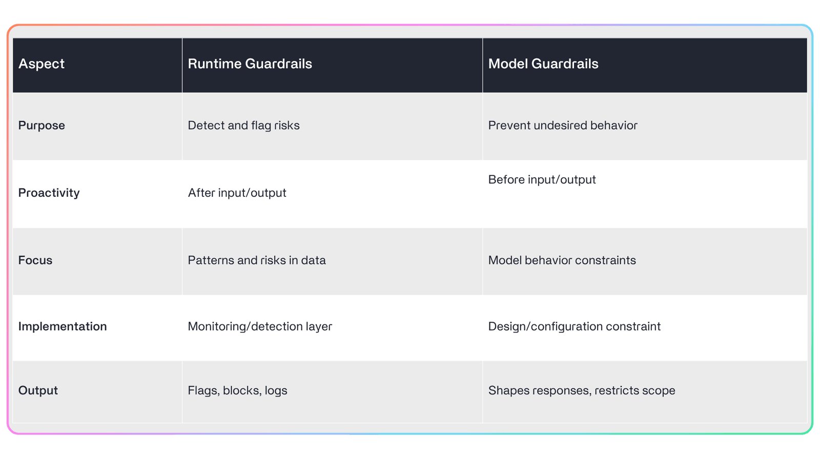While both runtime guardrails and model guardrails contribute to AI security, they operate in fundamentally different ways. This table outlines the distinctions at a glance.