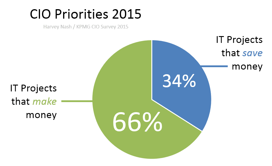 Coming in second to – drum roll please – lowering operational costs. That’s the save money in a Harvey Nash/KPMG CIO survey, which 34% of CIOs indicate gets prioritization.