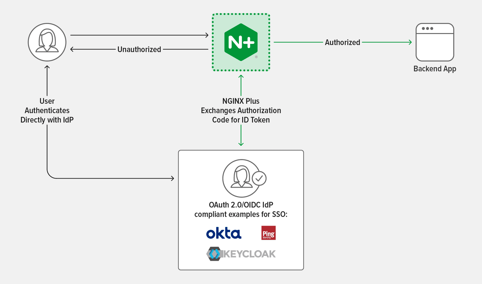 - Phase 3 – F5 NGINX Plus authenticates app and API clients and enforces authorization requirements using native features and integrations with third‑party, single sign‑on (SSO) solutions
