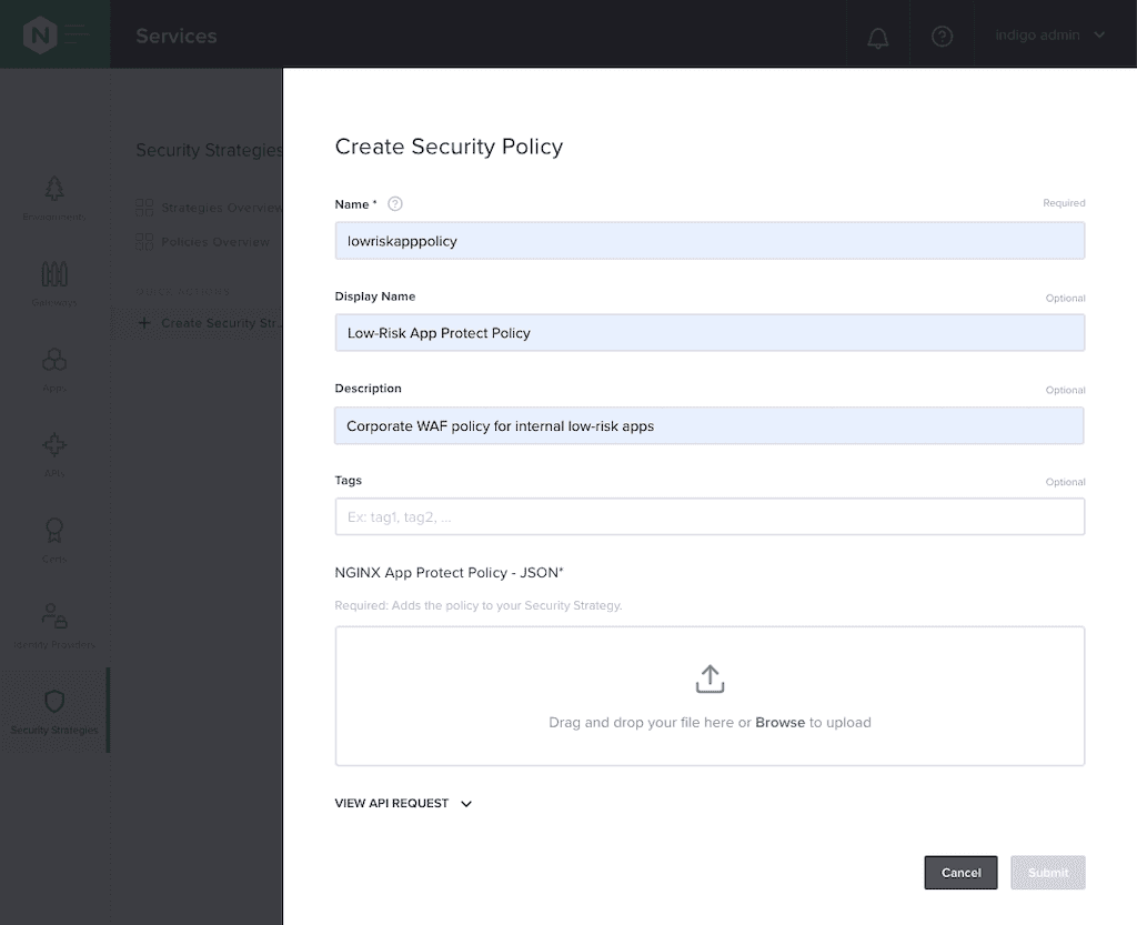 - Dev and DevOps teams can use the Controller API and GUI they’re already familiar with to apply the approved WAF policies to their apps, without the need for in‑depth understanding of either the policies or the configuration of the NGINX App Protect WAF instances which are enforcing the policies on the data plane.