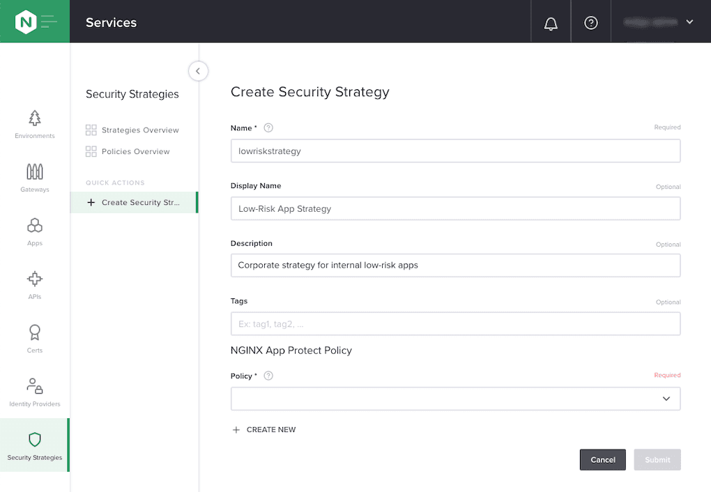 - Create a Security Strategy on the Create Security Strategy page.