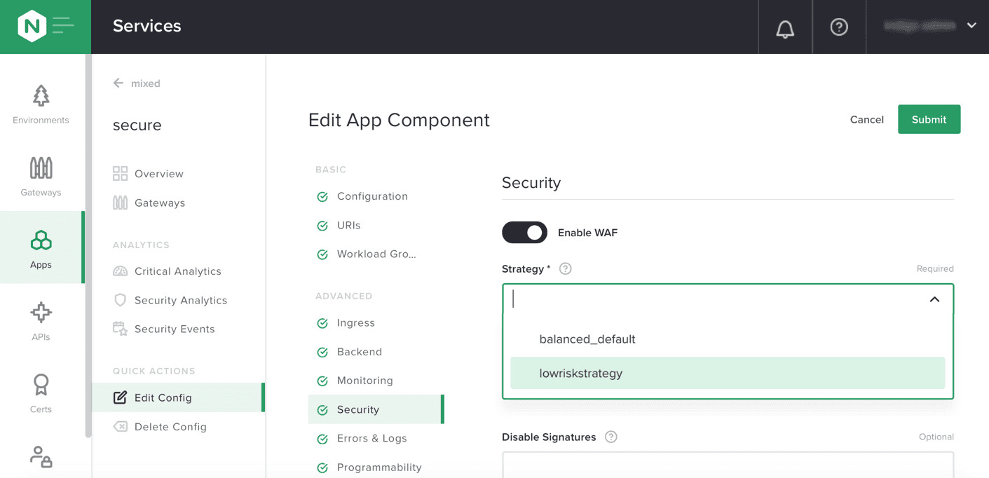 - On the Edit App Component page for the App to which you’re applying the WAF policy, select the associated Security Strategy.