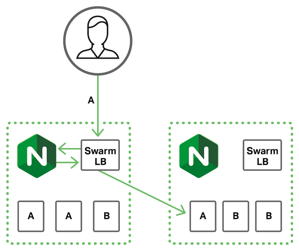 As shown in Figure 5, when a client makes a request for service A to the first Swarm node, the Swarm load balancer on that node routes the request to NGINX. NGINX processes the request, in this example doing SSL/TLS decryption, and routes it to the VIP for service A. The Swarm load balancer routes the (now unencrypted) request to one of the containers for service A, on any of the Swarm nodes.