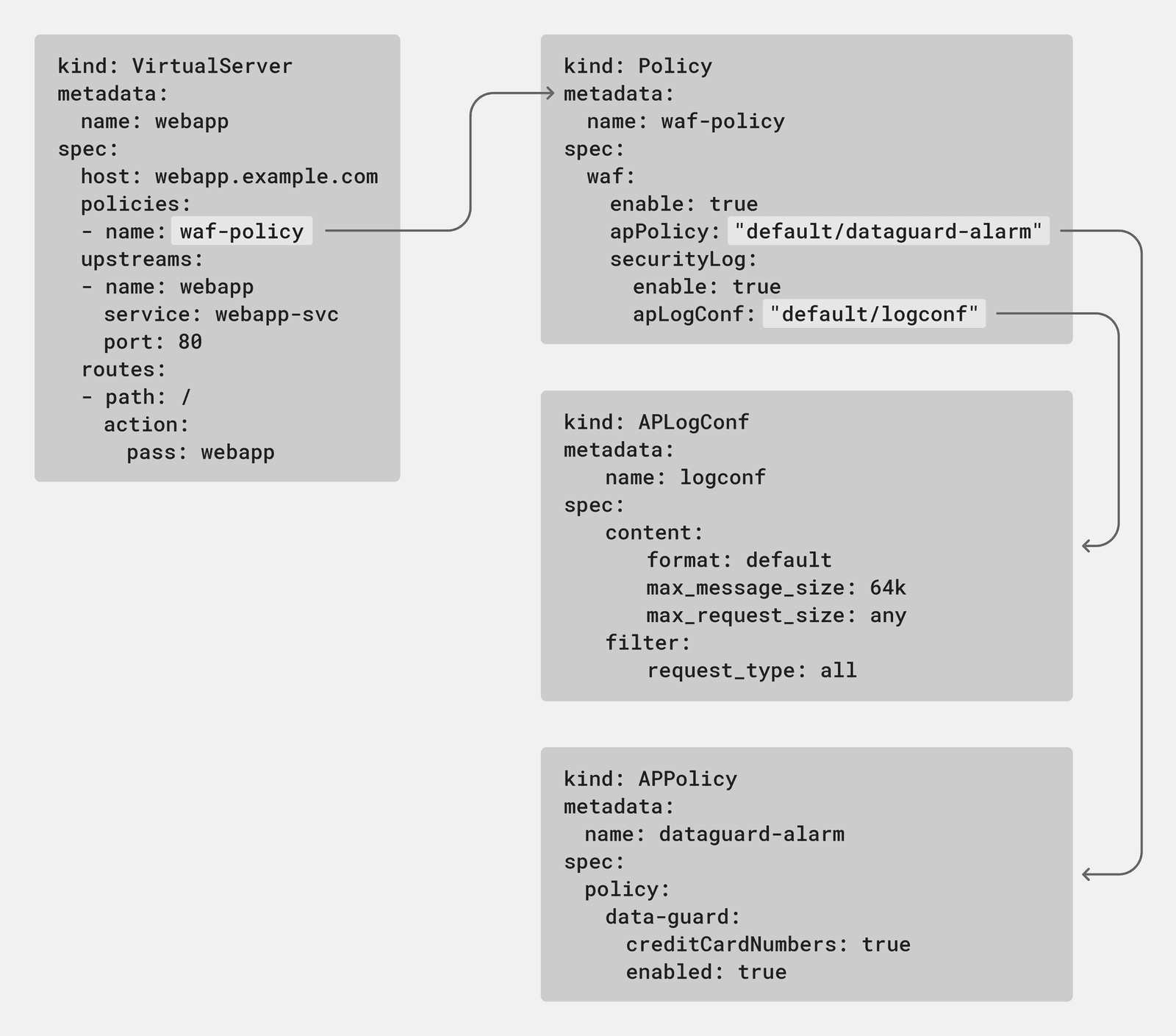 Release 1.11.0 introduces a native web application firewall (WAF) Policy object to extend these benefits to configuration of NGINX App Protect in your Kubernetes deployments. The policy leverages the APLogConf and APPolicy objects introduced in release 1.8.0 and can be attached to both VirtualServer (VS) and VSR resources. This means that security administrators can have ownership over the full scope of the Ingress configuration with VS resources, while delegating security responsibilities to other teams by referencing VSR resources.