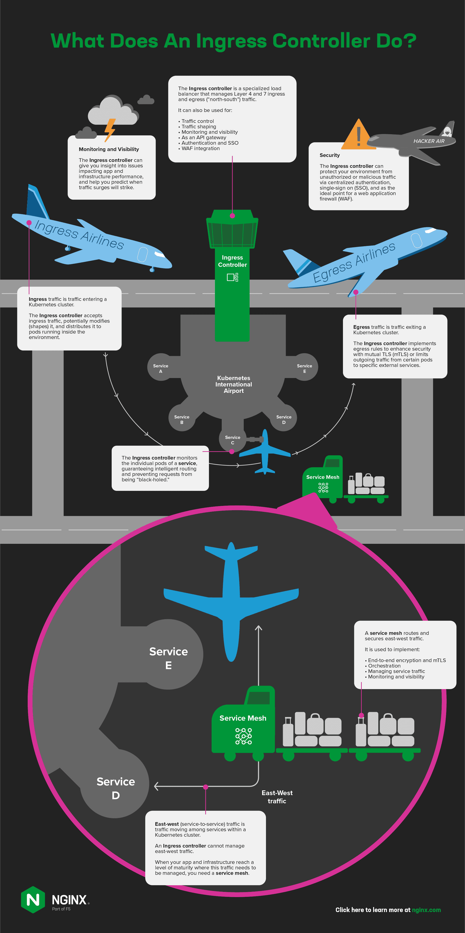 An Ingress controller is a specialized load balancer that manages the Layer 4 and 7 traffic entering Kubernetes clusters, and potentially the traffic exiting them. So that we’re all on the same page, here are the terms we use at NGINX (and they’re largely the same across the industry):