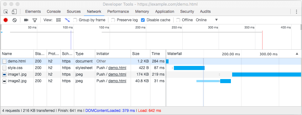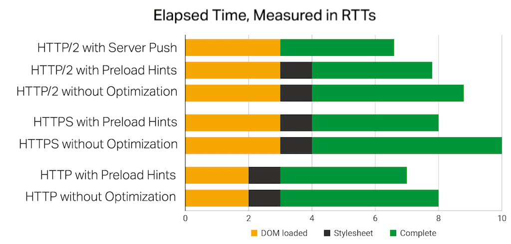 For example, the Chrome team has published some detailed recommendations on when to deploy server push, and has taken measurements on more complex sites to compare the effects of no optimization, preload hints, and server push over HTTP/2. Their Rules of Thumb for HTTP/2 Push report is worth reading for anyone considering deploying HTTP/2 server push in production.