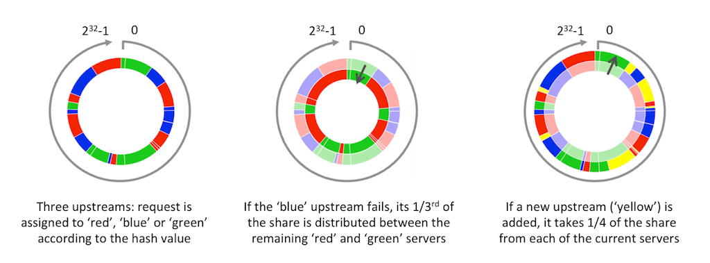 With consistent hashing requests are shared evenly among the target servers based on the hash value of the user‑specified key. If a server is added or removed (because it fails, for example), the minimum possible hash space is redistributed to minimize any cache misses. For even distribution, NGINX Plus’s ketama‑based implementation uses 160 points per server in the hash space (the illustration above shows only 8 points).