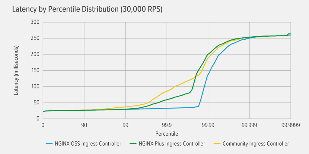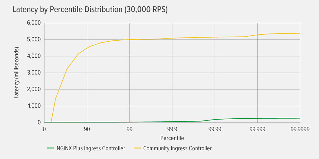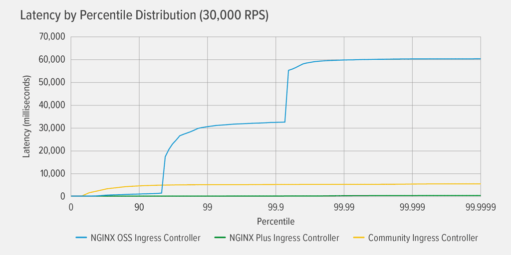 It’s clear that only the NGINX Plus-based Ingress controller performs well in this environment, suffering virtually no latency all the way up to the 99.99th percentile. Both the community and NGINX Open Source‑based Ingress controllers experience noticeable latency at fairly low percentiles, though in a rather different pattern. For the community Ingress controller, latency climbs gently but steadily to the 99th percentile, where it levels off at about 5000ms (5 seconds). For the NGINX Open Source‑based Ingress controller, latency spikes dramatically to about 32 seconds by the 99th percentile, and again to 60 seconds by the 99.99th.