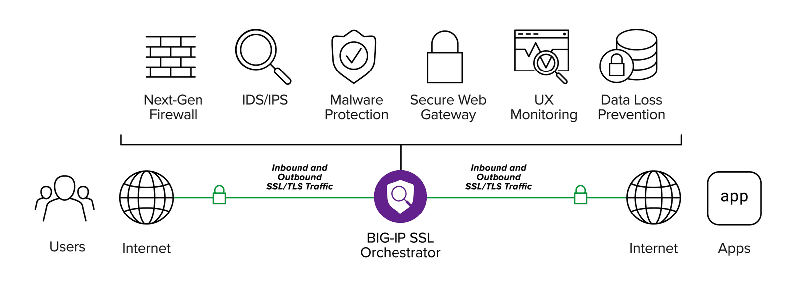 Delivering centralized control and policy-based steering, BIG-IP SSL Orchestrator enables you to offload encrypted traffic management for your AWS apps for greater efficiency and higher performance. Eliminate the performance degrading daisy-chaining of various security solutions by using BIG-IP SSL Orchestrator to create security based on the type of incoming traffic, ensuring optimal security against encrypted ransomware attacks. BIG-IP SSL Orchestrator adapts to changing network conditions and organizational needs, ensuring apps are always secure and available.