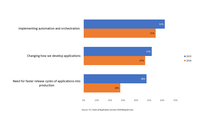 In order to keep up with the rapid rate of change required for applications that are customer-centric and drive revenue, organizations are ramping up their use of technologies that provide deeper insights, deliver faster release cycles, and enable application portability. Five years ago, the industry was questioning the role of traditional IT organizations – today IT organizations are embracing cloud and investing in the skills and toolsets required for automation. They clearly have a seat at the digital table, with 42% of the respondents reporting that IT decides the location decisions of applications – up from 30% last year. As we look ahead, we know the rate of change will continue to increase. Nearly half (48%) of the respondents reported that digital transformation was requiring a need for faster release cycles –up 20 points from 28% in 2018.
