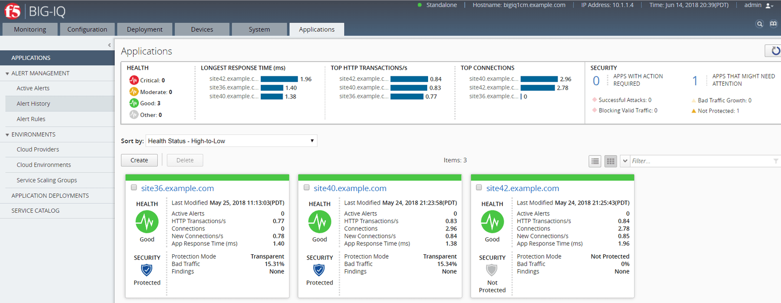 Below, we see the application portal—a summary of all apps supported by F5 devices in an environment. At a glance we can see that my 3 apps are in good shape—though one lacks security.