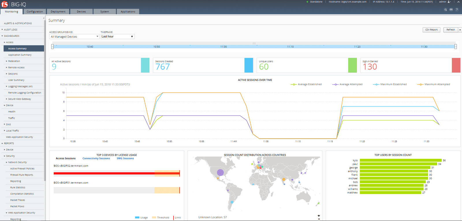 While application security analytics are new and highly useful, don’t neglect the device and security analytics found in the Monitoring Tab of BIG-IQ (shown in the image below). Under this tab you will find dashboards for Access, Device health and traffic, DNS services and Local Traffic Management. This tab also includes central alerts, security, and performance reports and event tracking.