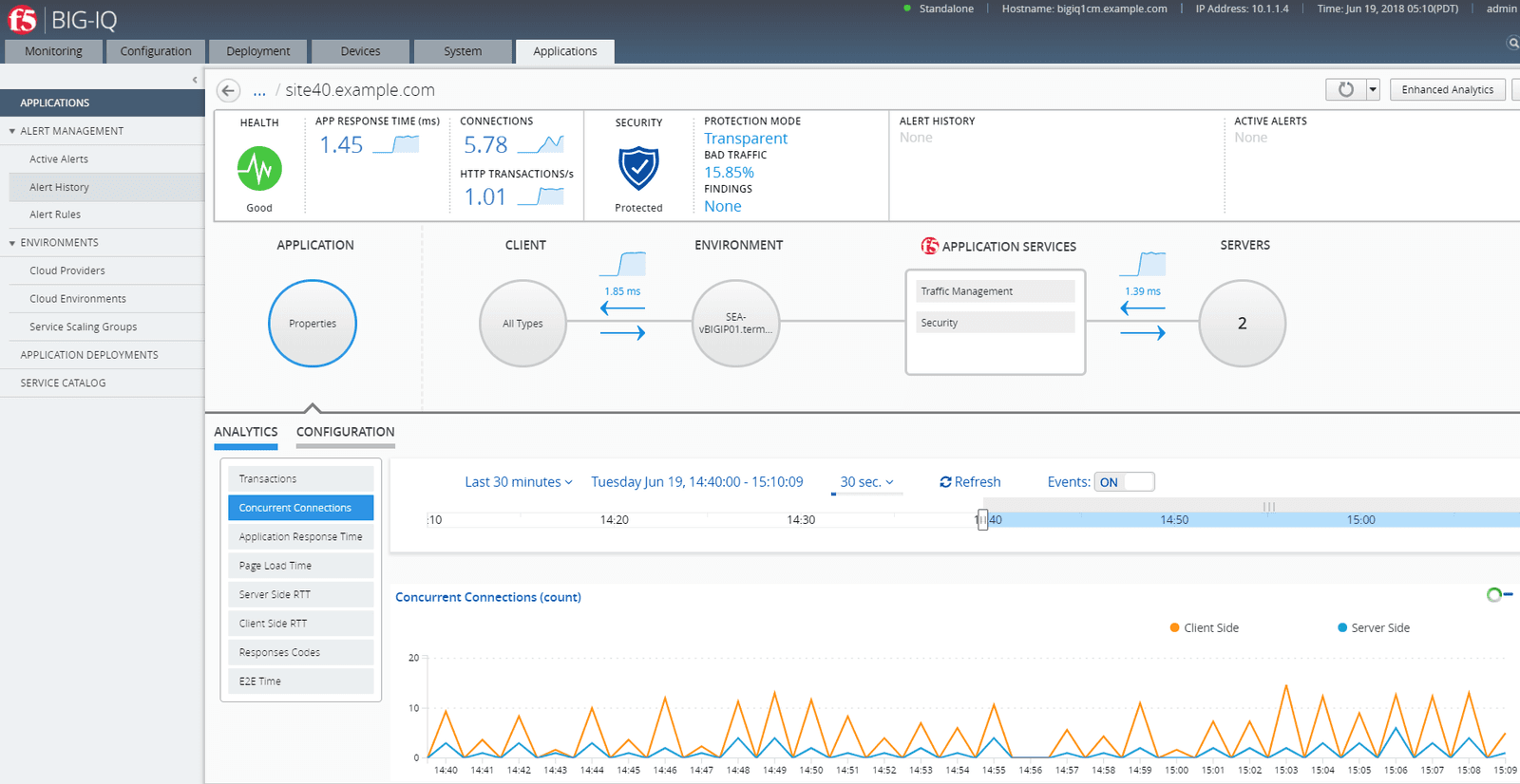 The center of the screen also has what's called an Application Configuration Map. Clicking on that would provide detailed analytics and configuration information on application traffic, client traffic, performance of the underlying hardware, F5 application services and the performance of servers hosting the applicaton.