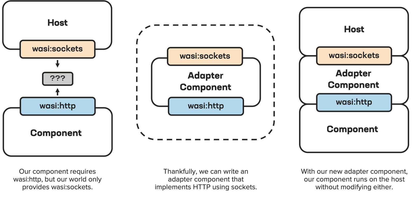 Worlds can be defined by anyone, but there are a number of standards-track worlds for components that can handle HTTP requests, access USB devices, use AI models, and many more to come. Host environments can advertise what worlds they implement to make it easy for developers to know which components work. Since components are composable, it’s also possible to implement some worlds in terms of other worlds and compose the two components. For example, if you have a host environment that implements a sockets world, but you have a component that wants to make HTTP requests in an HTTP world, you can write an adapter component that implements the HTTP world using sockets: