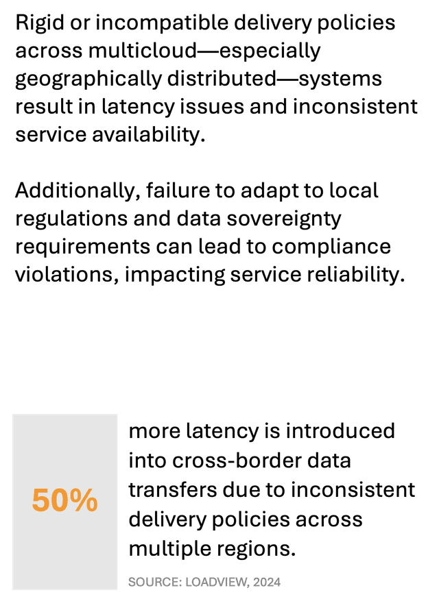In hybrid multicloud environments, incompatible delivery policies can pose significant challenges to application performance, availability, and scalability. These incompatibilities often arise when organizations use multiple cloud providers, each with unique traffic routing, security, and data handling protocols.