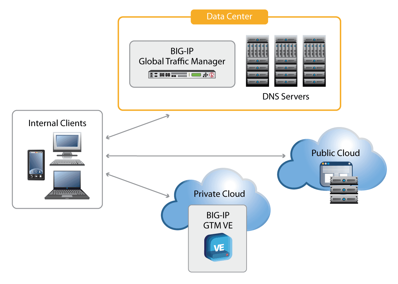 With BIG-IP GTM, organizations can gain a single point of control for their inbound DNS and global server load balancing in cloud deployments. The virtual edition (VE) of BIG-IP GTM can be deployed in VMware vSphere, Microsoft Hyper-V, and Citrix XenServer environments3 (https://www.f5.com/resources/white-papers/the-dynamic-dns-infrastructure#footnote03) to provide the same services that the physical version provides. BIG-IP GTM VE inside the virtual environment can provide LDNS for virtual applications, and a physical BIG-IP GTM standalone device can ensure availability externally.