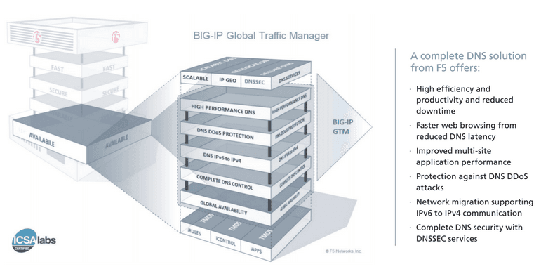 When used behind DNS Express, the DNS servers become merely the storage and administrative control points for DNS management. This means fewer servers are required. Like other F5 products, BIG-IP GTM is an ICSA Labs Certified Network Firewall, so it can be placed in a DMZ or even outside the firewall perimeter.