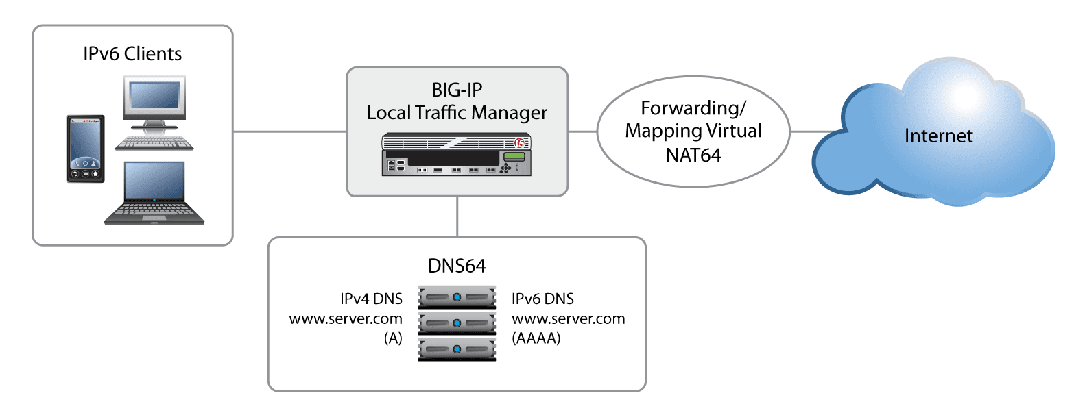 Network address translation with the NAT64 gateway in BIG-IP Local Traffic Manager (LTM) provides an IPv6 to IPv4 proxy for application delivery. BIG-IP GTM'S DNS64 gateway automatically simulates the IPv6 address and invokes the NAT64 proxy.