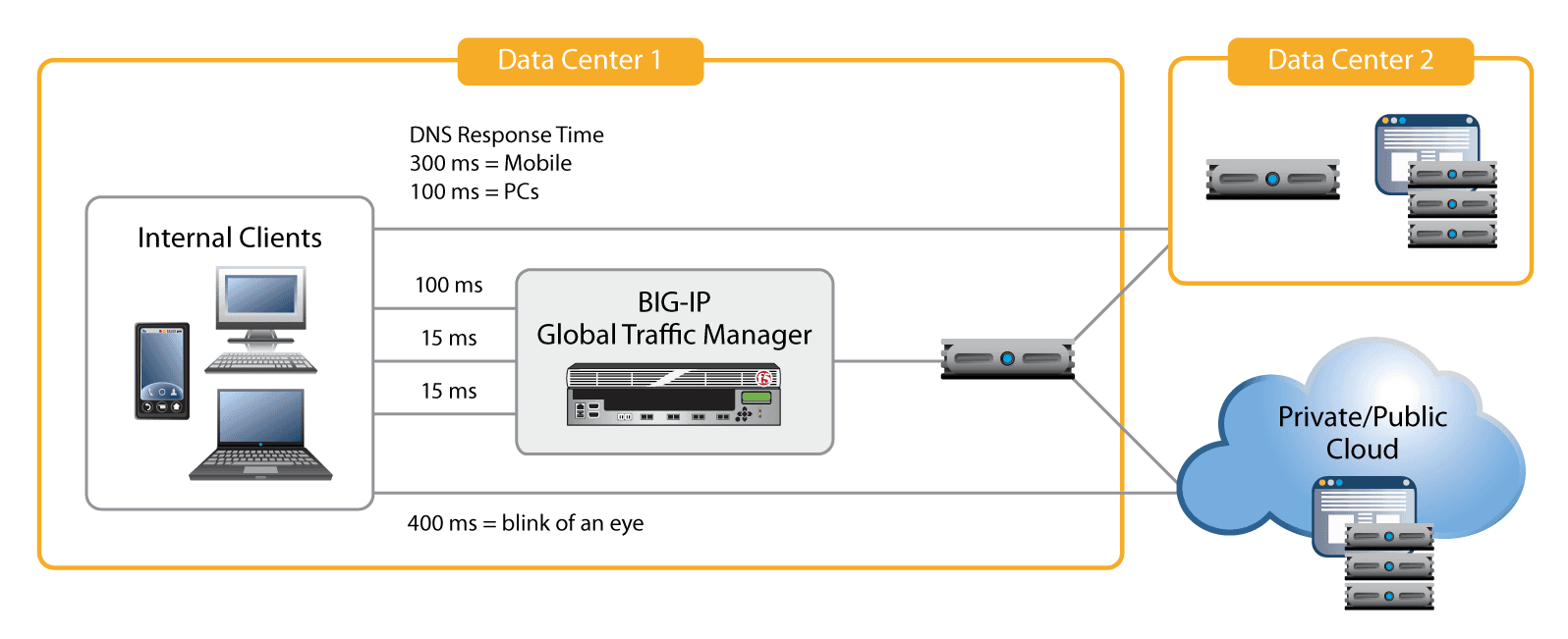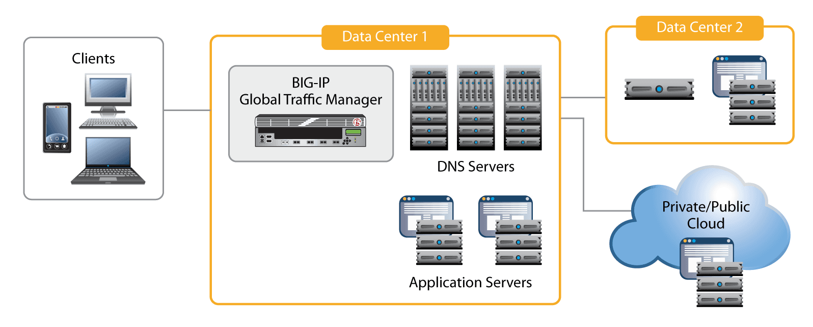 Whether organizations have global data center infrastructure, enterprise data centers, or a mix of both plus private or hybrid cloud services, solutions based on BIG-IP GTM help them protect, scale, and deliver their applications to the world.